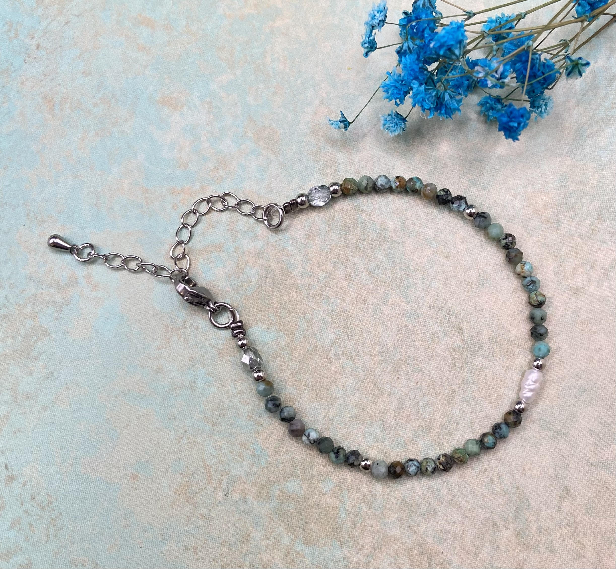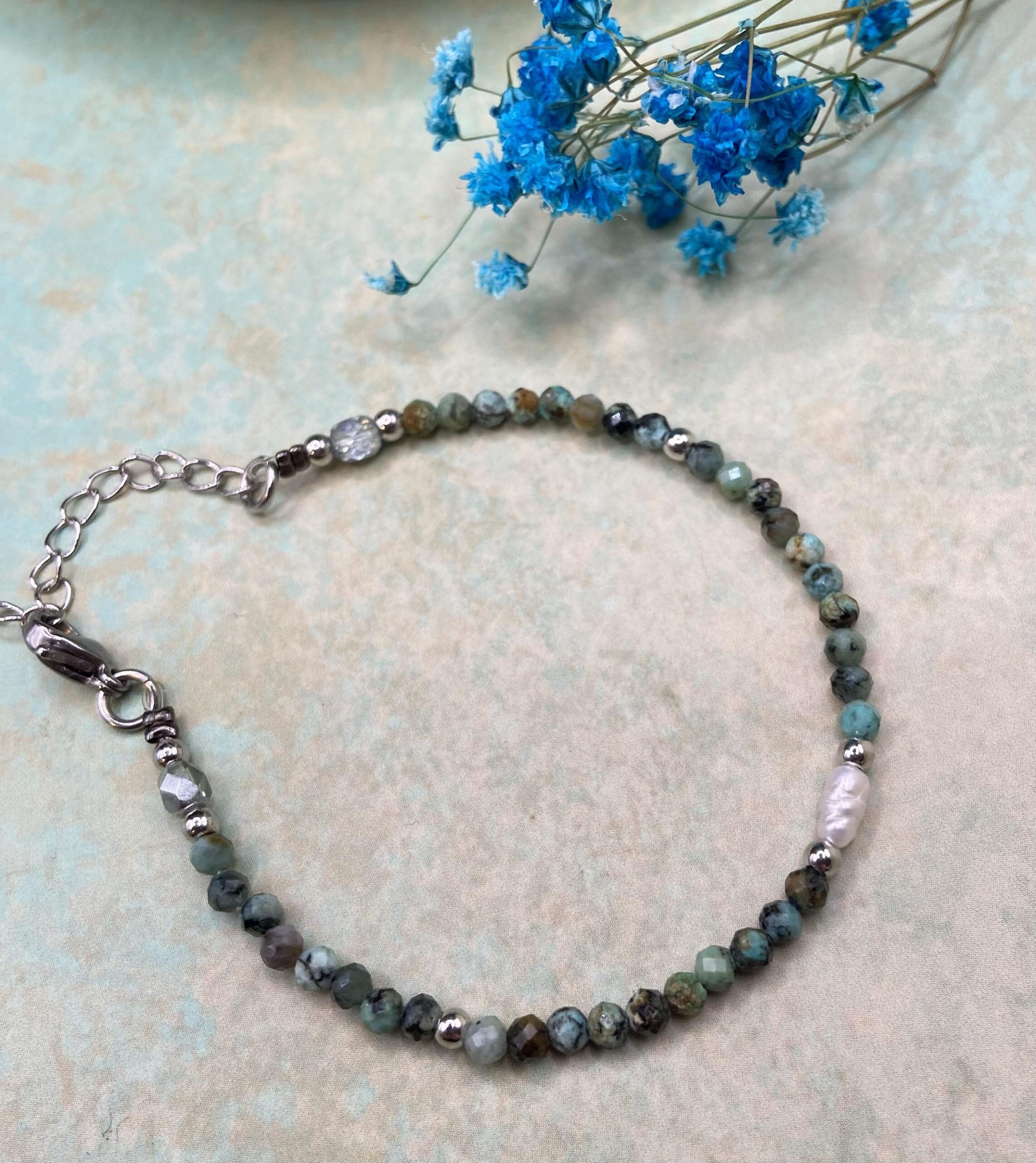 צמיד מהמם עשוי חרוזי טורקיז אפריקאי עדינים בשילוב חרוזים מצופים כסף ובמרכז פנינה בודדת לאפקט מרשים.