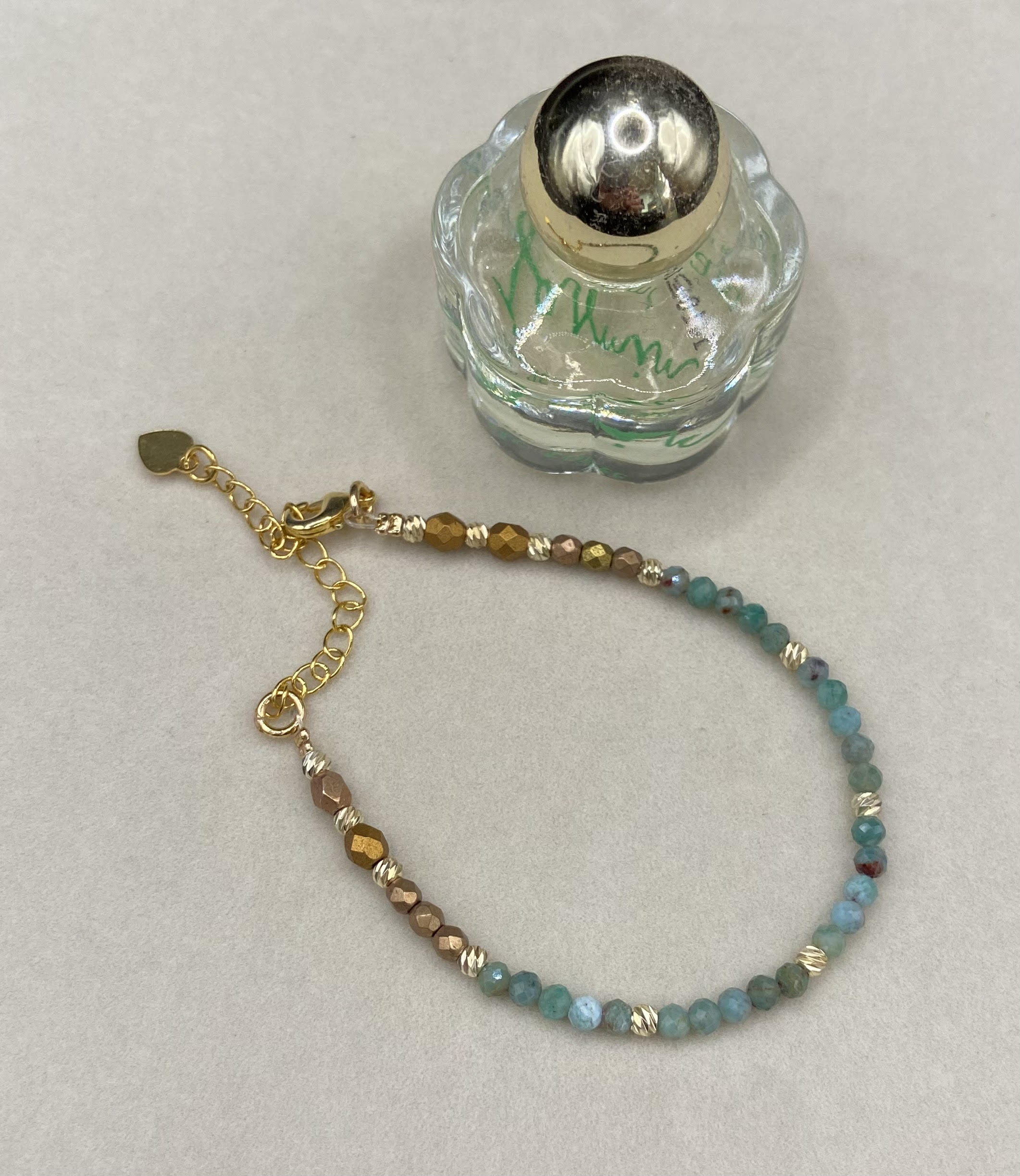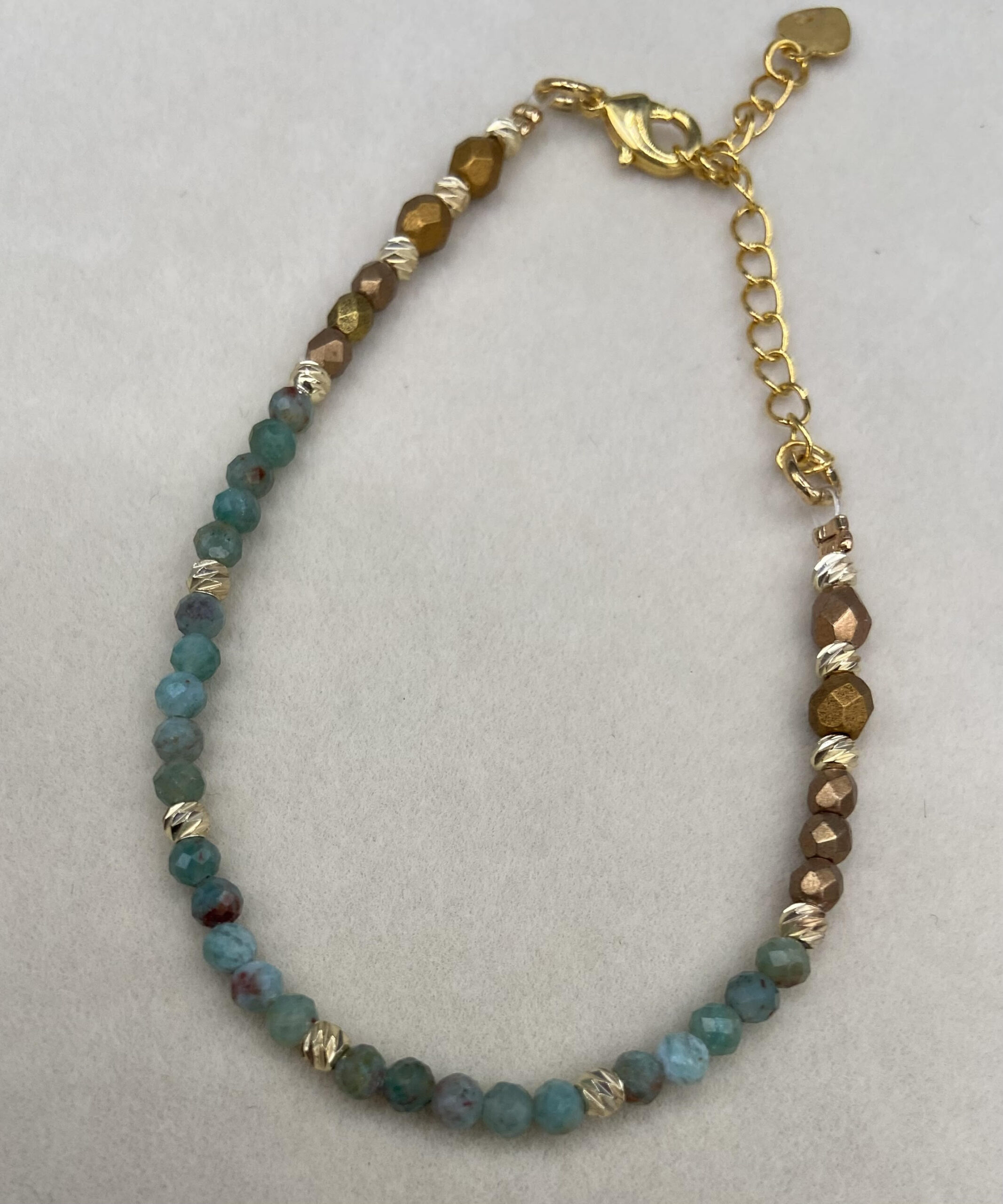 צמיד בעל נוכחות, עשוי חרוזים ירקרקים בשילוב קריסטלים בגוון מטאל כתום-חום וחרוזים מצופים זהב.