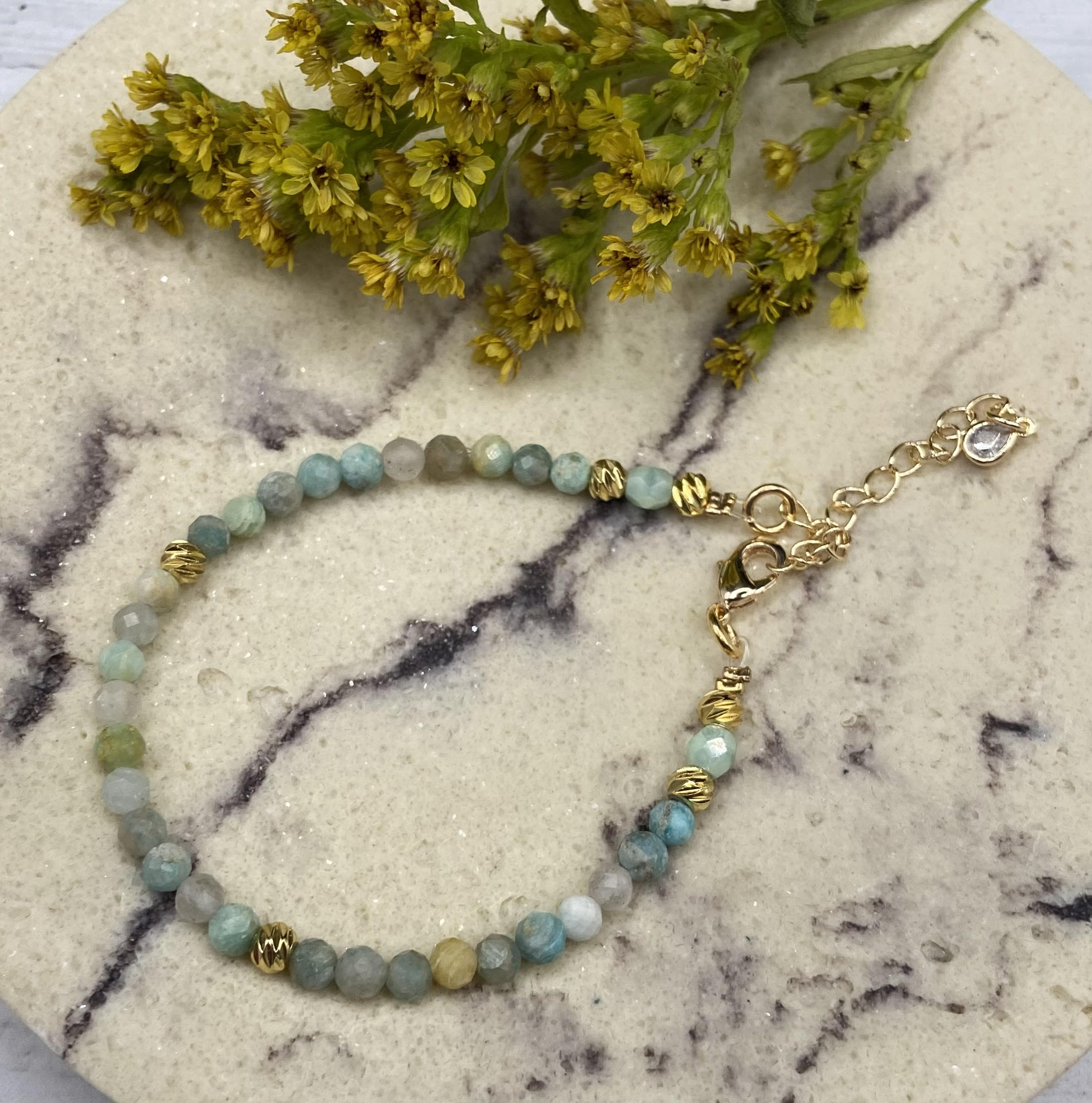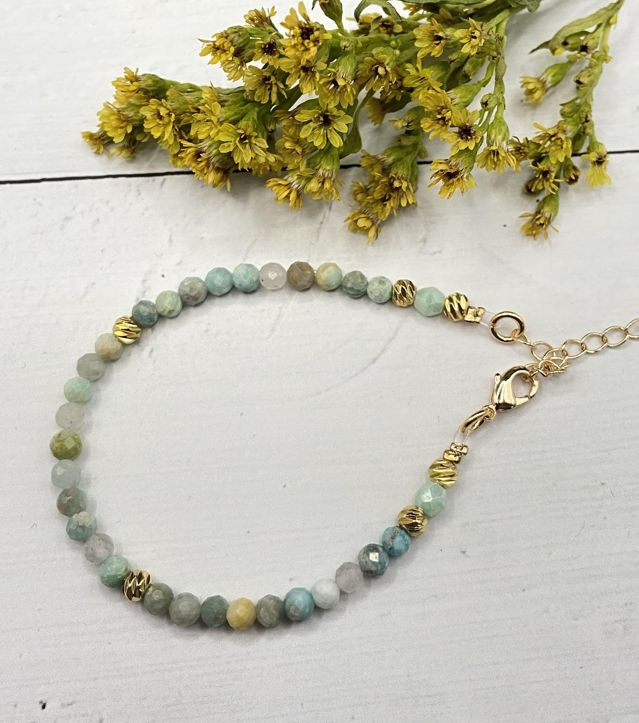 צמיד עדין ויפה, עשוי חרוזים בגוון טורקיז בהיר, בשילוב חרוזים מצופים זהב וקריסטלים איכותיים בגוון ירקרק בהיר נדיר.