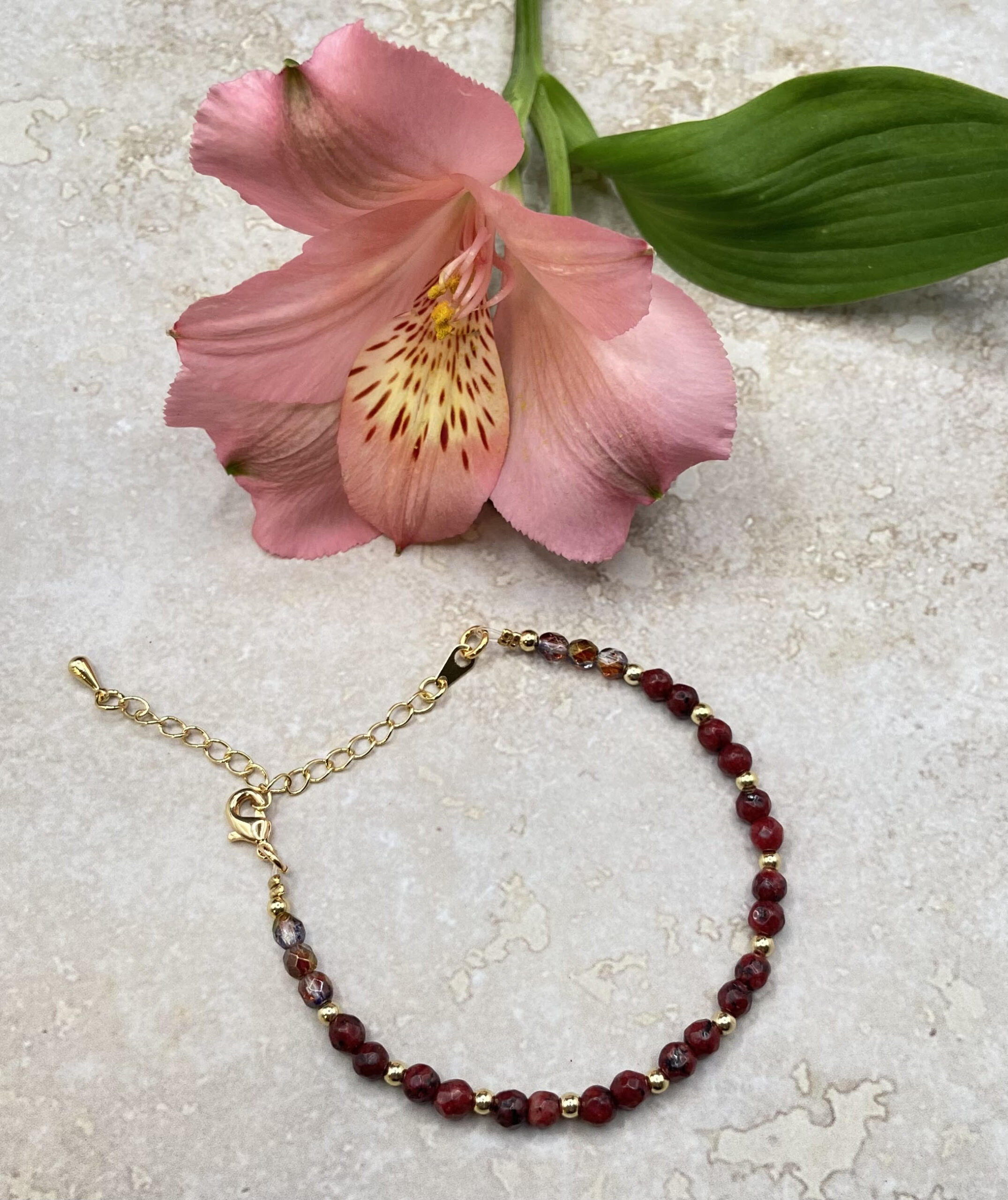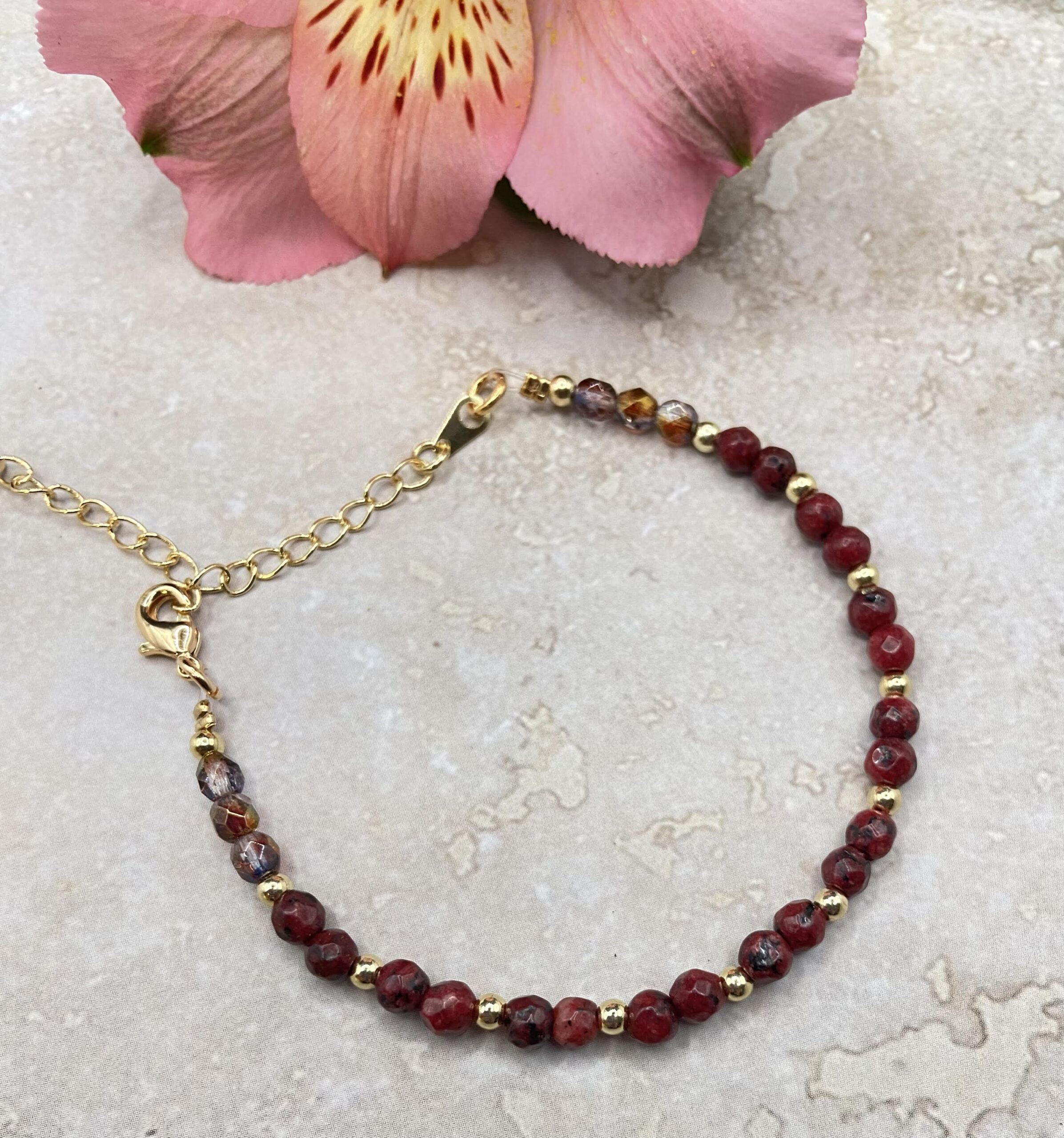 צמיד יוקרתי ואותנטי, עשוי חרוזים נדירים ואותנטיים בגוון בורדו בשילוב חרוזים מצופים זהב. למראה מושלם ומיוחד.
