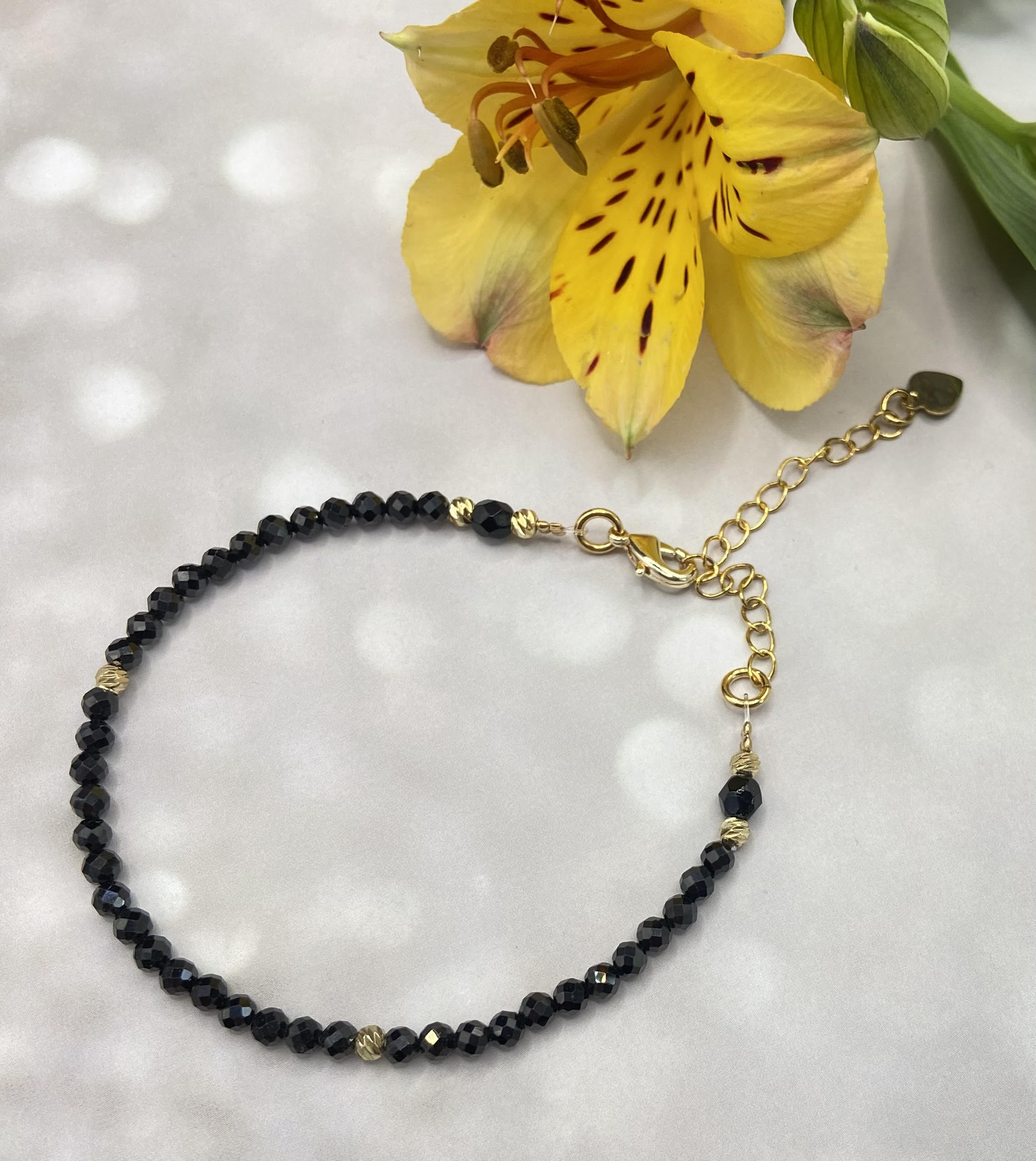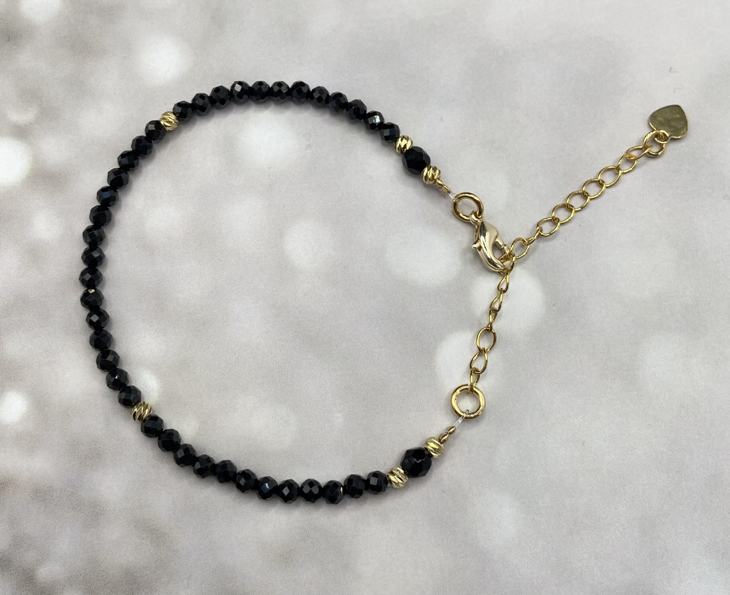 צמיד עשוי חרוזים שחורים בשיבוץ חרוזים מצופי זהב ובגימור קריסטלים שחורים. למראה אלגנטי, יוקרתי ומלא ביטחון.