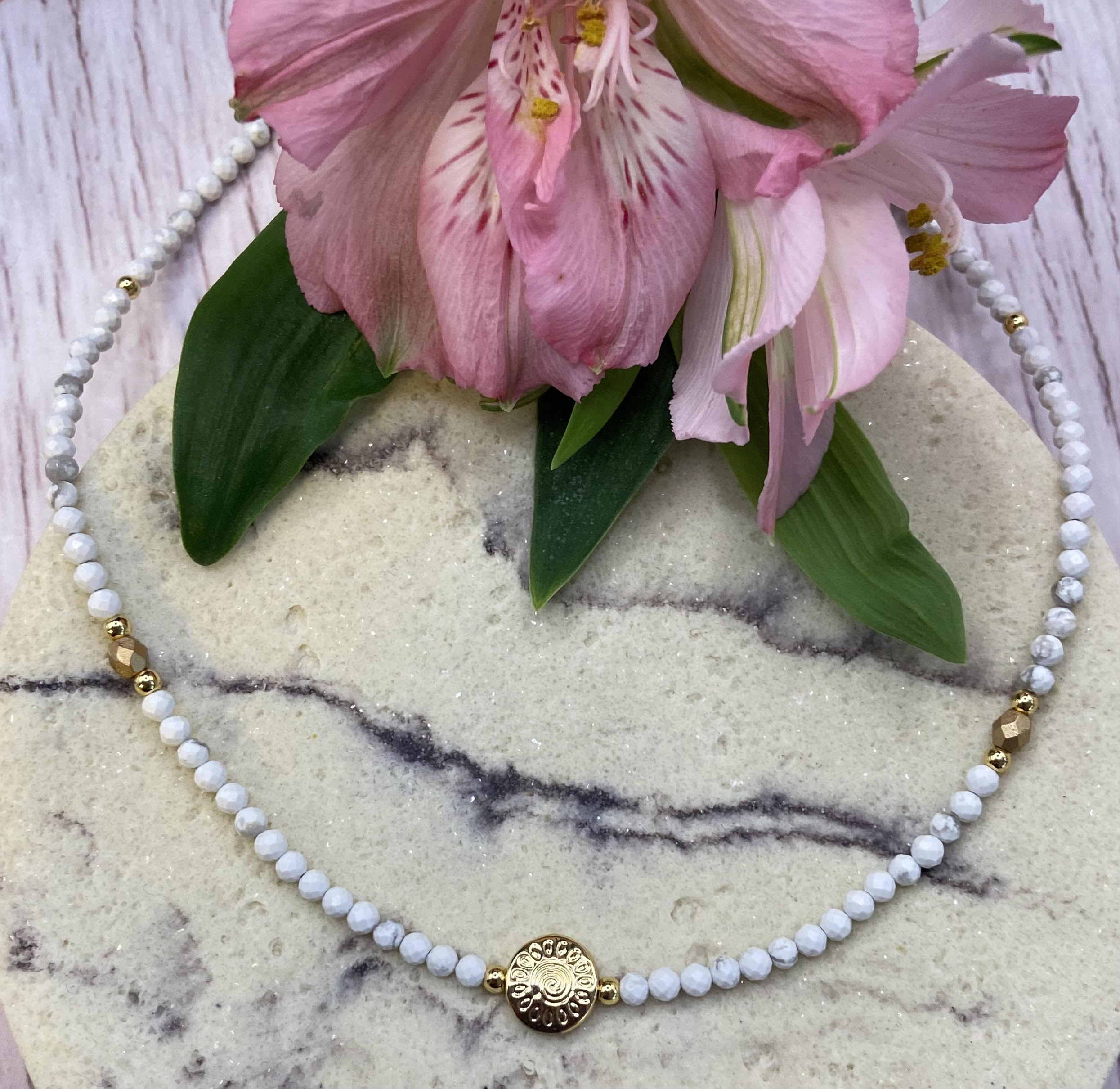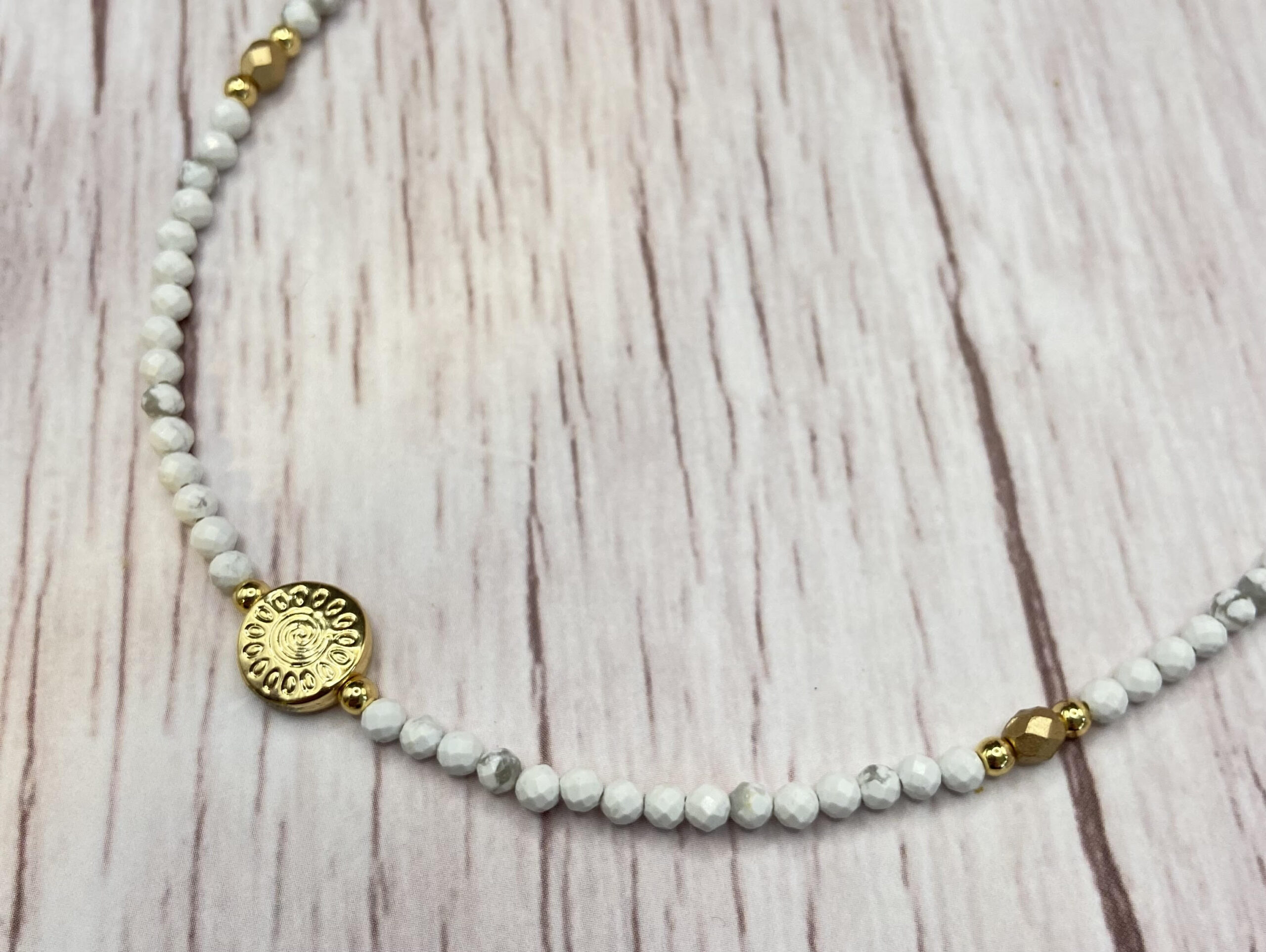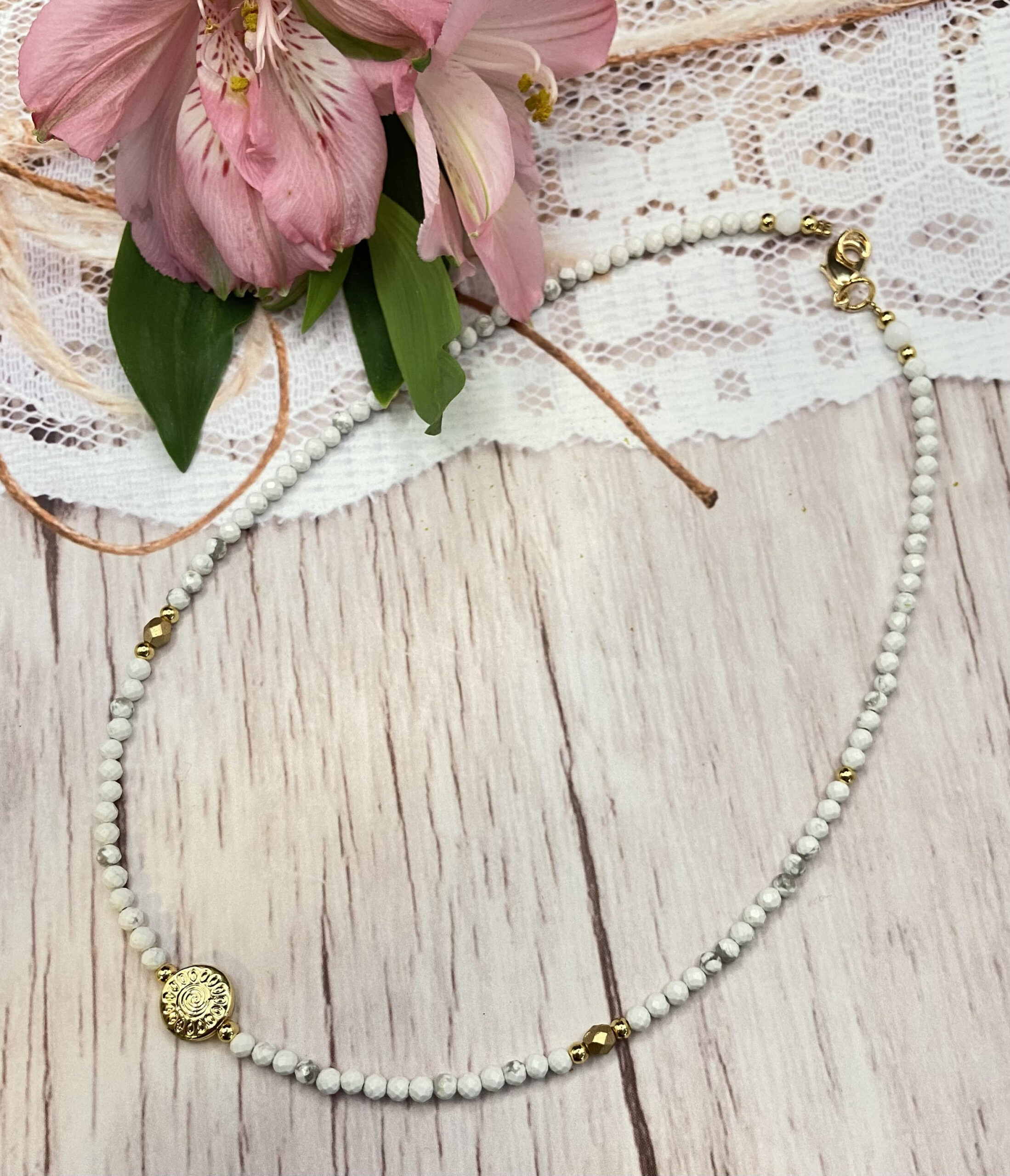 שרשרת בעיצוב מנצח, עשויה חרוזים לבנים עם נגיעות אפרפר, בשילוב חרוזים בציפוי זהב וקריסטלים לבנים וזהובים. במרכז השרשרת אלמנט דקורטיבי מצופה זהב.