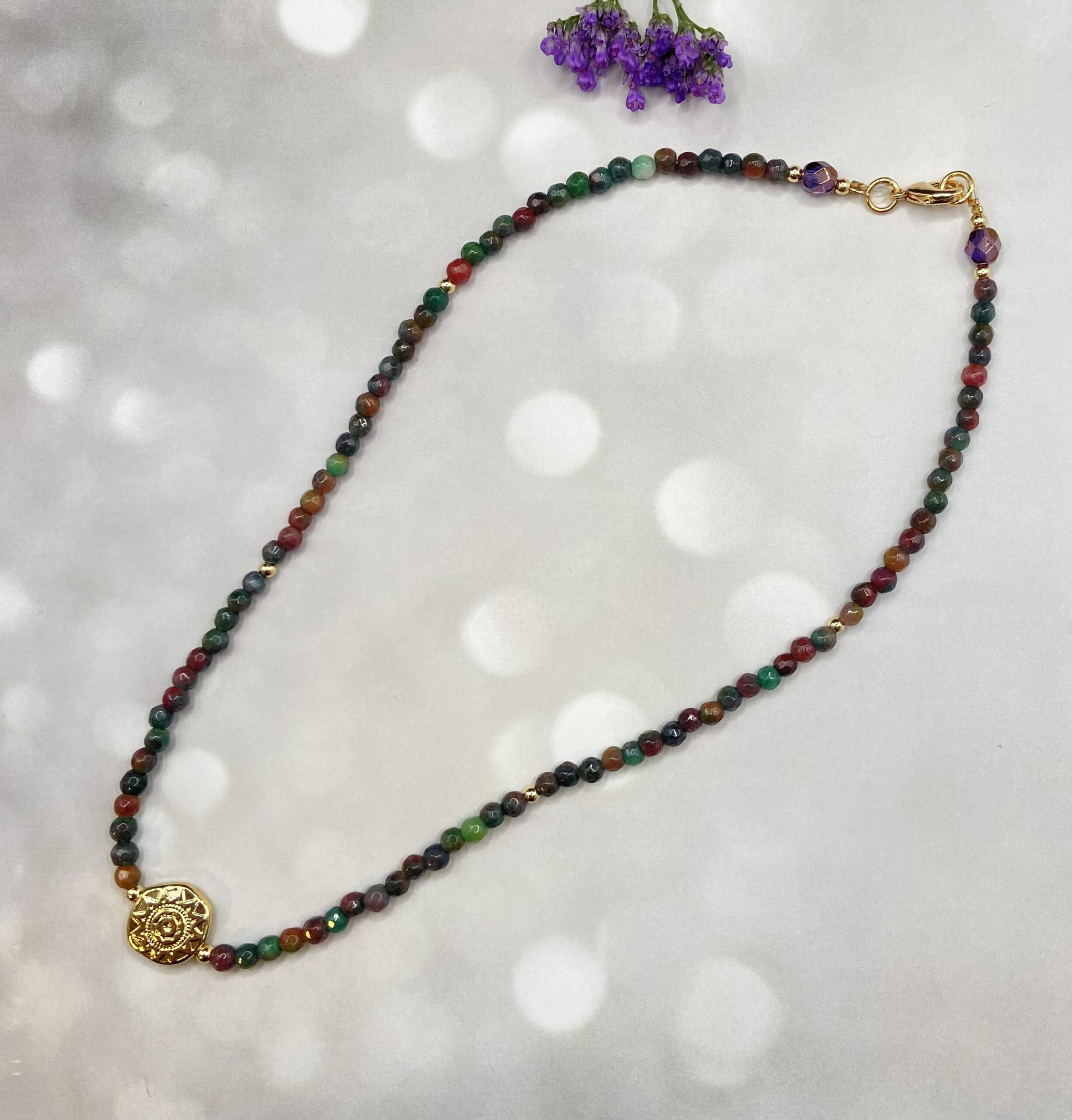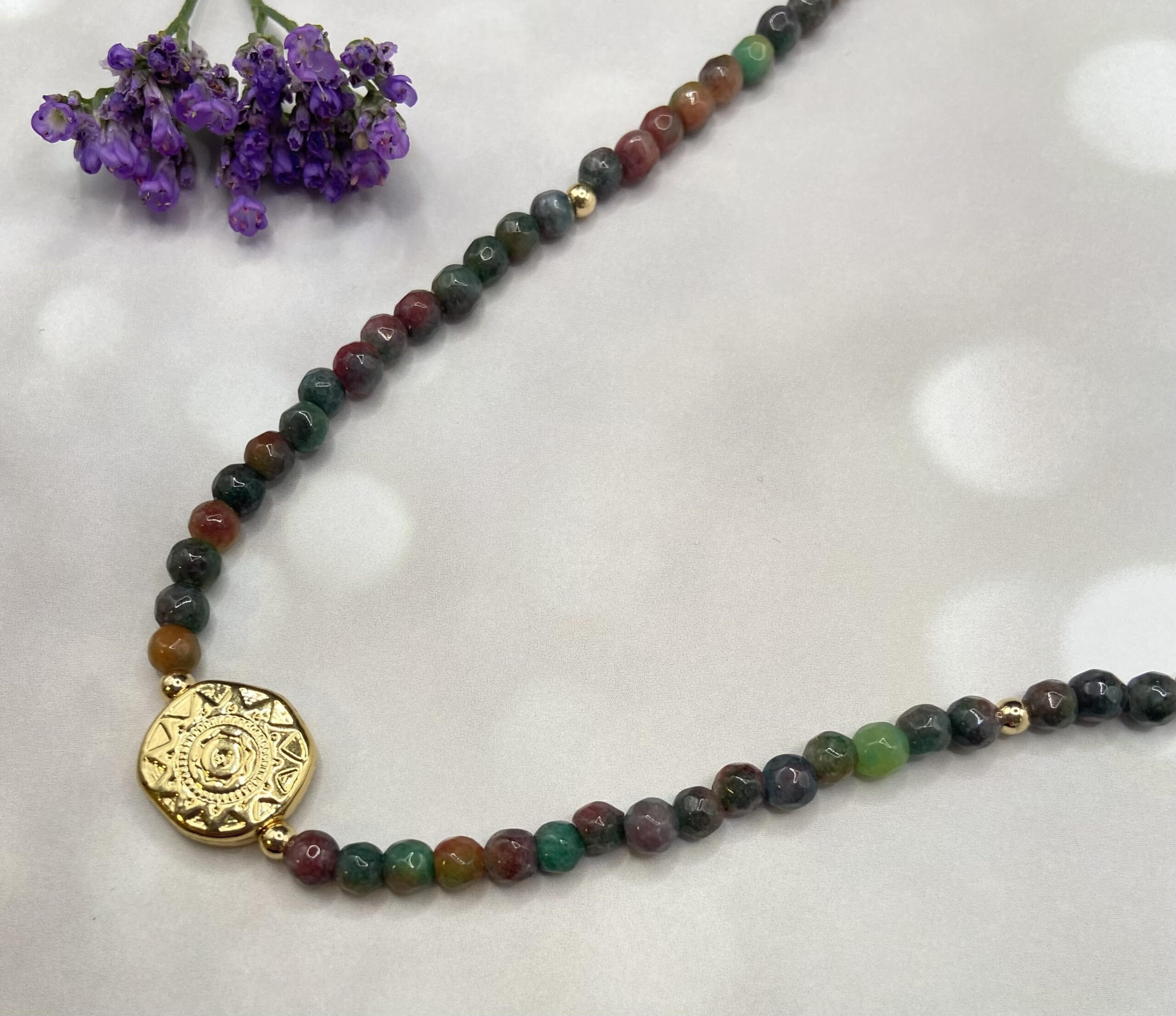 שרשרת ייחודית ומיוחדת, עשויה חרוזי אגת נדירים בגווני ירקרק-ורדרד-כתמתם, בשילוב חרוזים מצופים זהב וקריסטלים. במרכז אלמנט דקורטיבי מצופה זהב. פשוט מושלמת!