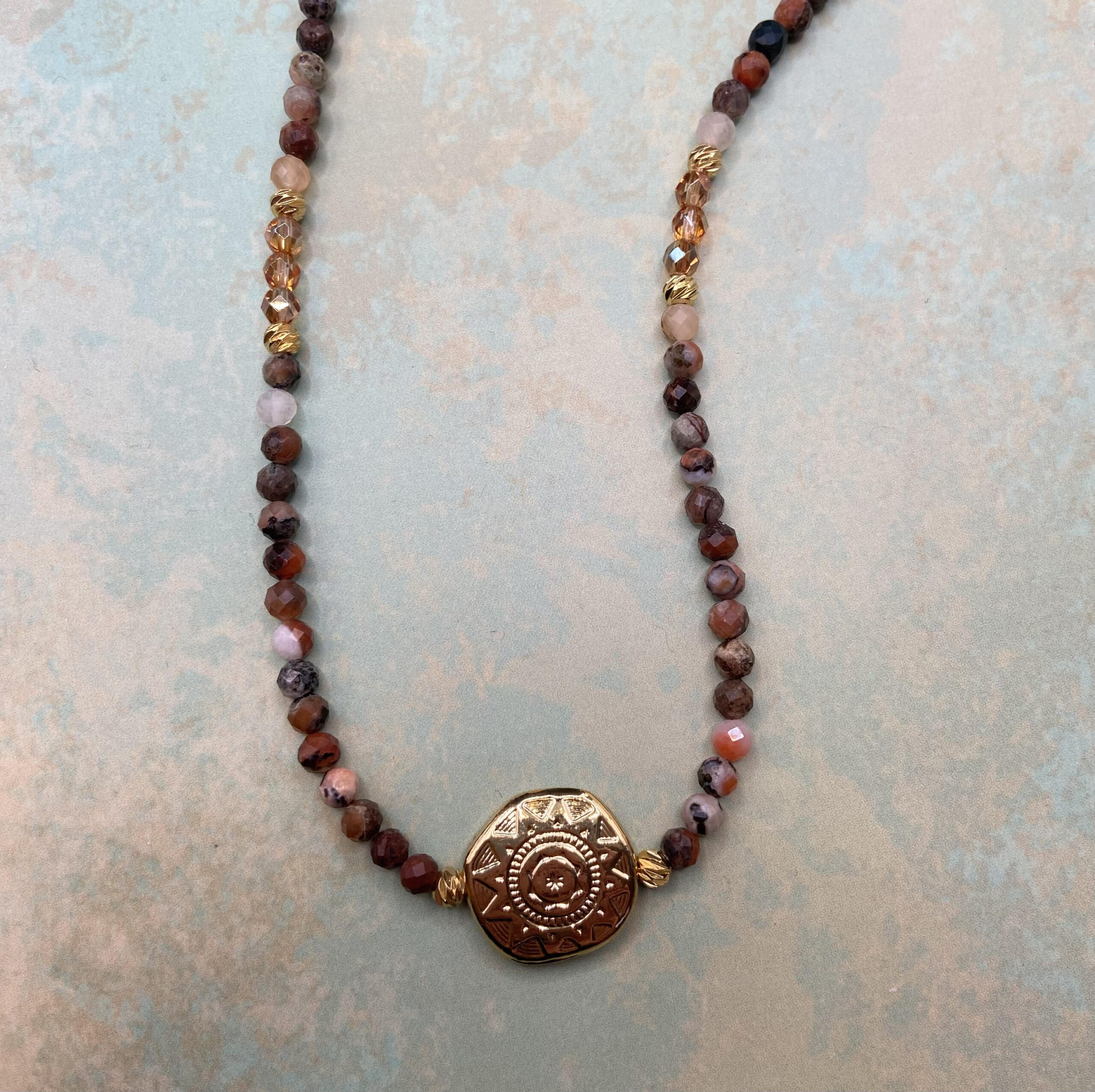 שרשרת ארוכה, עשויה חרוזים בגווני חום-כתום משתנים, בשילוב קריסטלים מדויקים וחרוזים מצופי זהב. במרכז השרשרת אלמנט דקורטיבי מצופה זהב. מתאימה למי שרוצה להרגיש עוצמתית!