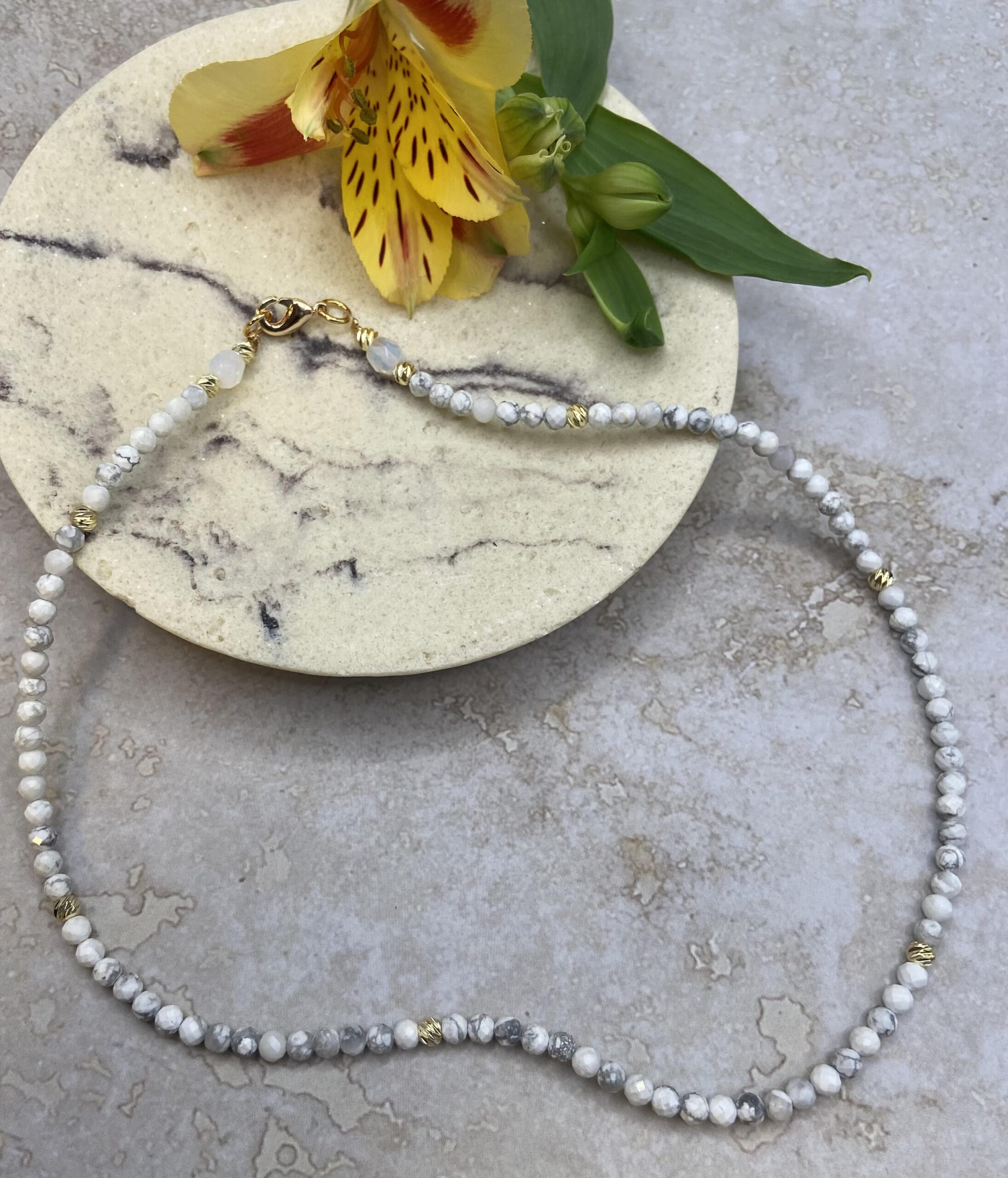 שרשרת לבנה, עשויה חרוזים בגווני לבן-אפרפר, מושלמת ובלתי נשכחת! בשילוב חרוזים בציפוי זהב ובסיומת קריסטלים גדולים חלביים. עיצוב מנצח!